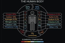 Even the human body reflects this cosmic origin. By mass, the average human body contains roughly 65% oxygen, 18% carbon, nearly 10% hydrogen, about 3% nitrogen, and smaller amounts of calcium, phosphorus, potassium, sodium, chlorine, magnesium, iron, zinc, and other elements.